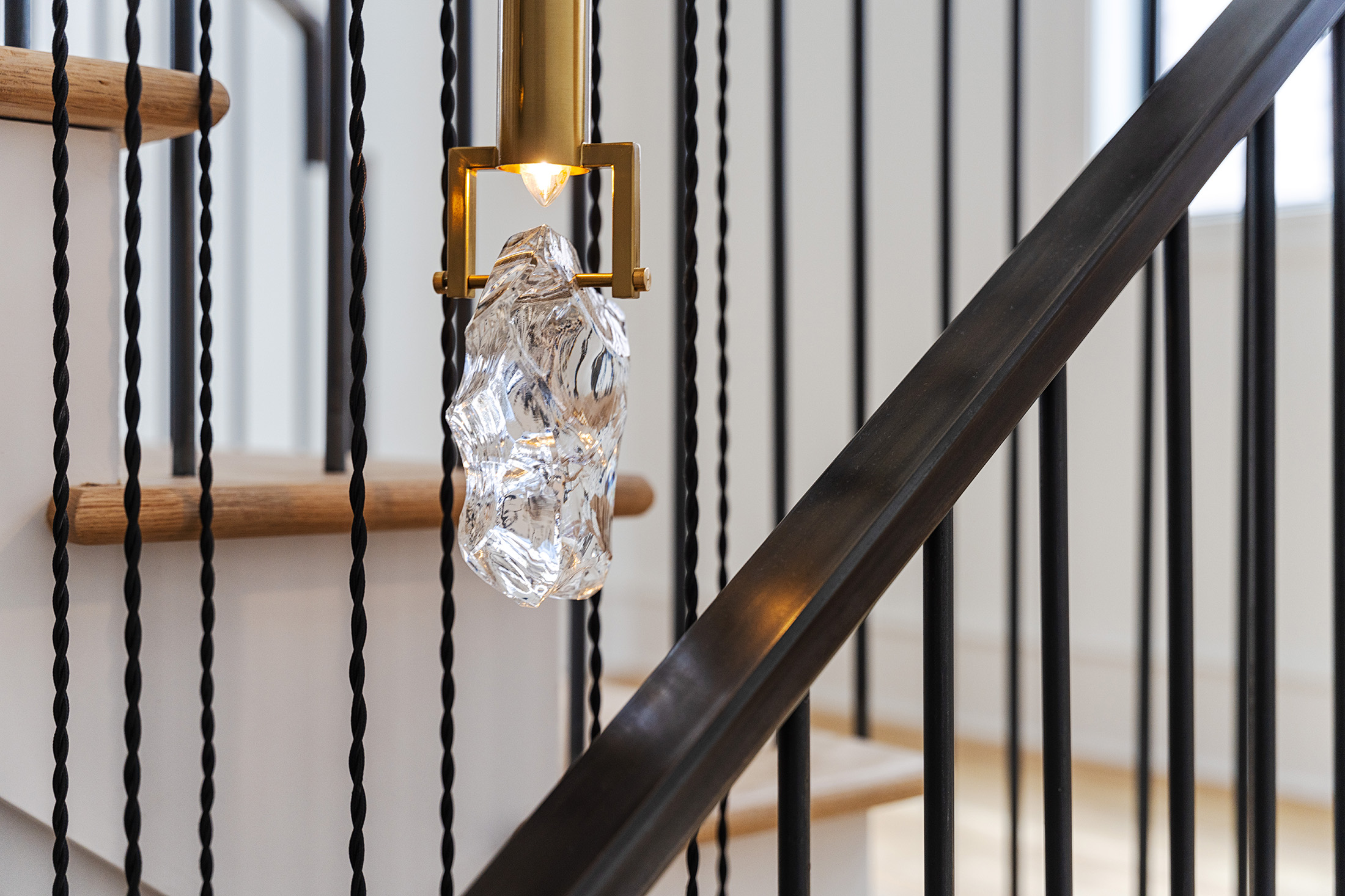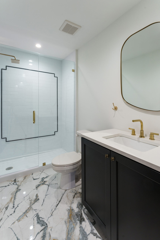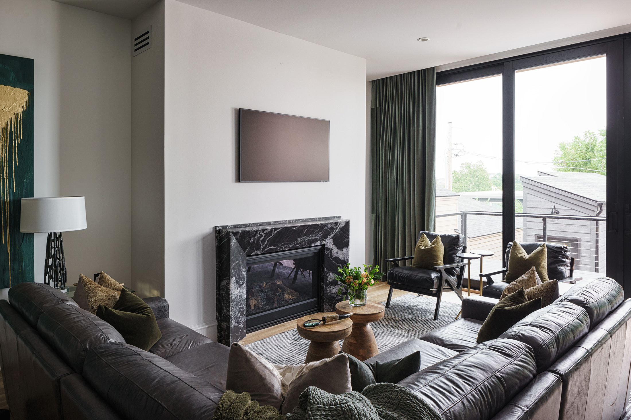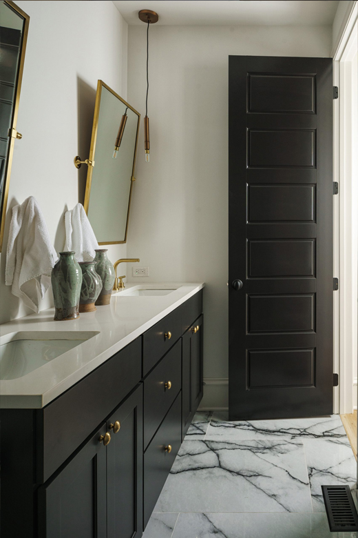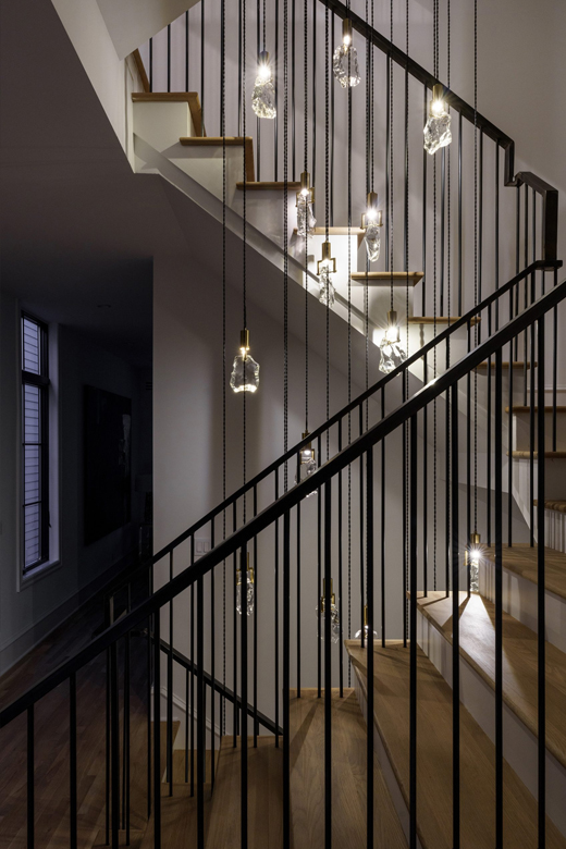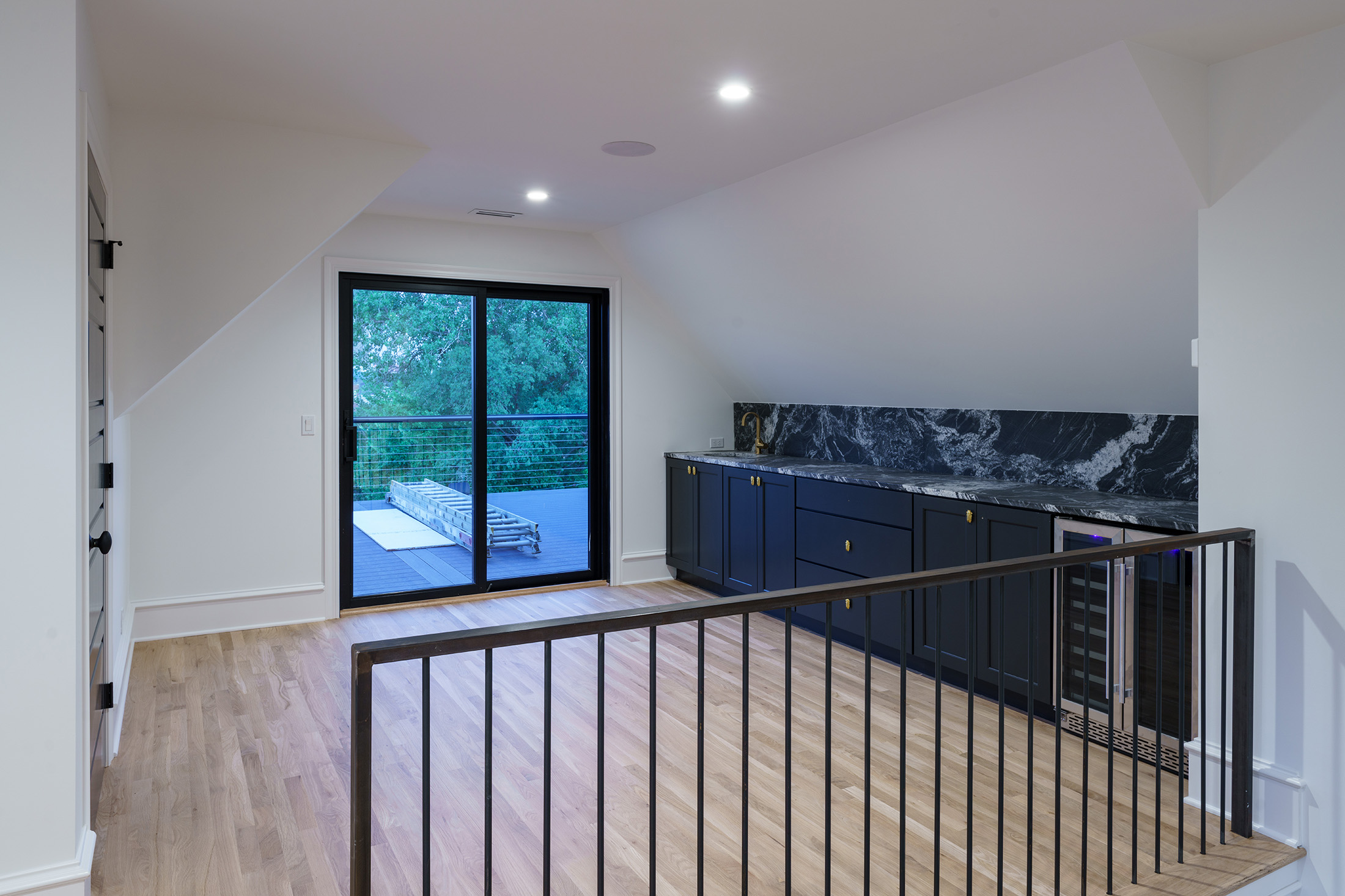 Like all homes in the Westside Collection, the inspiration for the 2-and-a-half story house with finished basement and detached garage came directly from the Westside’s original 1920s and 30s-era homes, which echoed early row home aesthetics. This modern rendition of that classic style features updates like standing-seam aluminum roofing, multiple outdoor decks facing the city skyline, large picture windows throughout, and open-concept layouts throughout the all-new construction. At 4 bedrooms and 3.5 bathrooms, complete with upstairs den that flows out to the rooftop deck, and a finished basement and detached garage, 2107 is a perfect example of how a sophisticated mood and a traditional ambience can co-exist side by side. Numerous brass fixtures, a clear quartz chandelier in the central space, black negresco leathered granite, and cut crystal lighting fixtures root the home in a dark academic tone, but are counterpointed with modern whimsical features to lighten and relax the space for all kinds of activities, entertainment, or quiet relaxation.