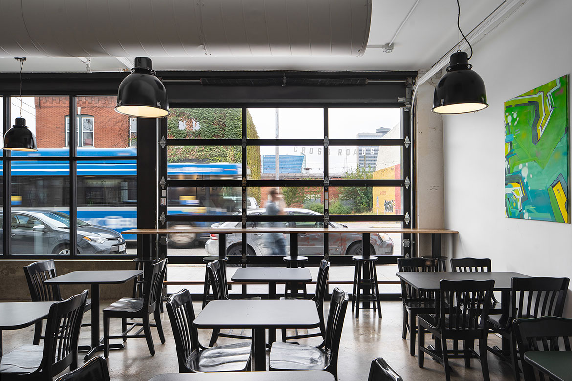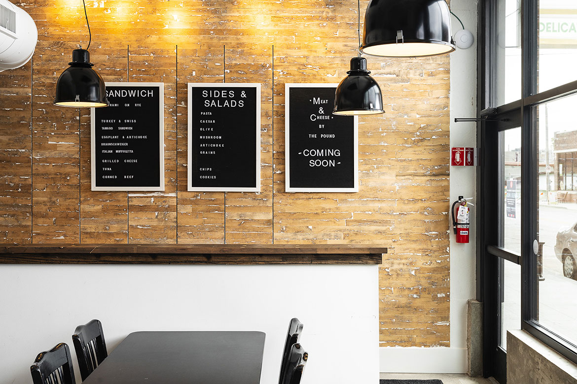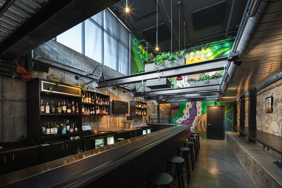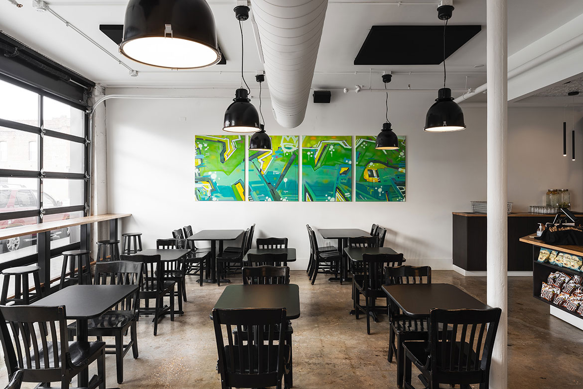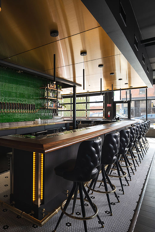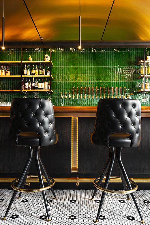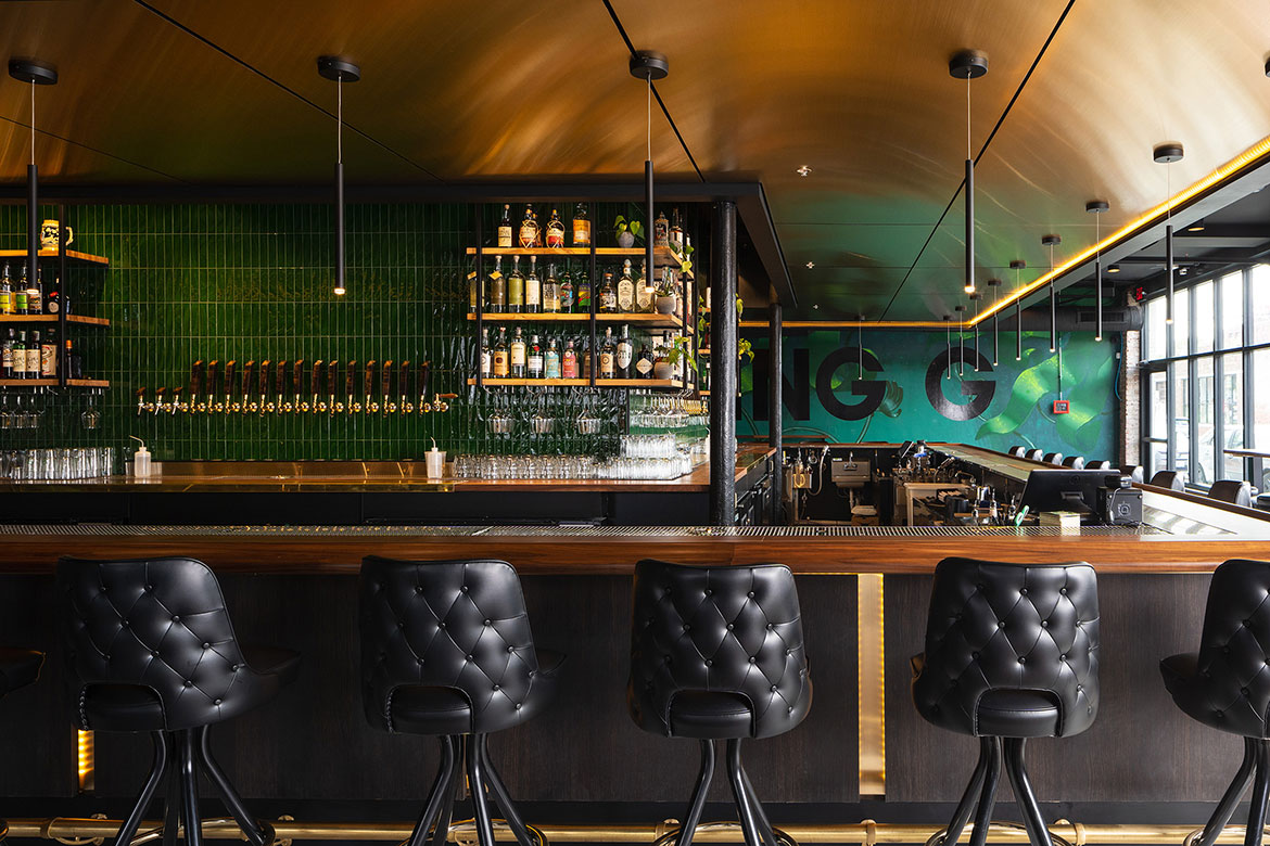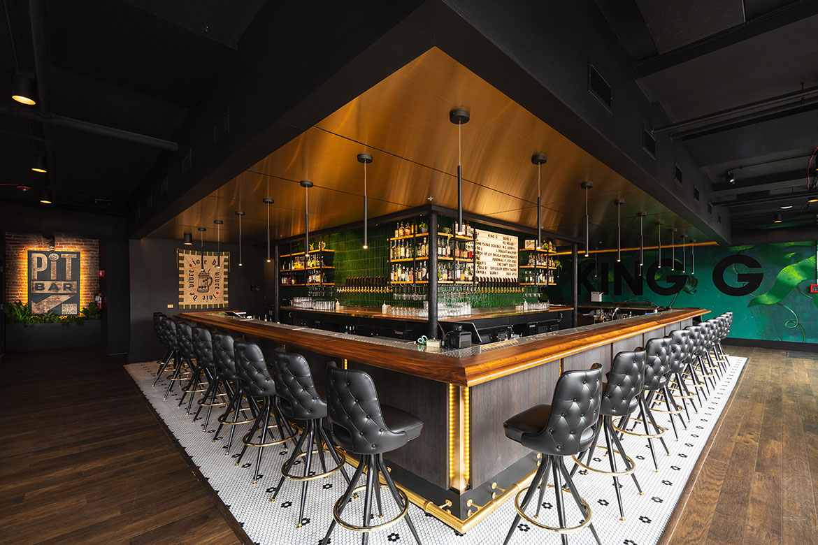 The King G bar and deli describes itself as a modern version of the classic neighborhood gathering spot, and wanted a look to match the vibe. For the bar, our team laid out a design plan that incorporated the urban edge and street art ambience of the neighborhood with chic hotel elements that made the whole place feel like it had been there for decades. Deep emerald green, rich wood tones, sleek brushed brass, thoughtfully placed graffiti walls, and a vintage inspired logo all come together for a next-level speakeasy atmosphere that is authentically KCMO. The deli space is equally authentic in execution, with bright subway tile walls, open wood shelving, bistro-style seating, and lots of natural light through oversized picture windows with custom-painted signage.